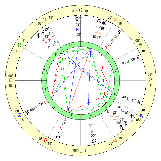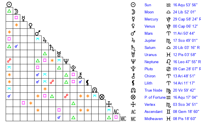 | Moon | 24 Libra 44 | 6 Gemini 0 | 10 Cancer 31 |