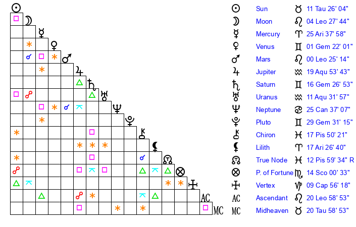 | Sun | 11 Taurus 26 | 12 Taurus 32 | 27 Leo 46 |