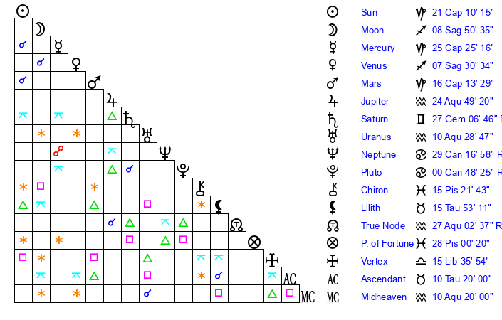 | Sun | 21 Capricorn 10 | 22 Capricorn 15 | 11 Taurus 55 |