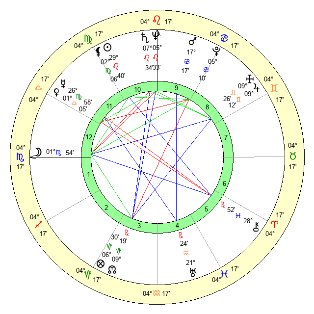 | Moon | 1 Scorpio 55 | 2 Virgo 20 | 17 Libra 41 |