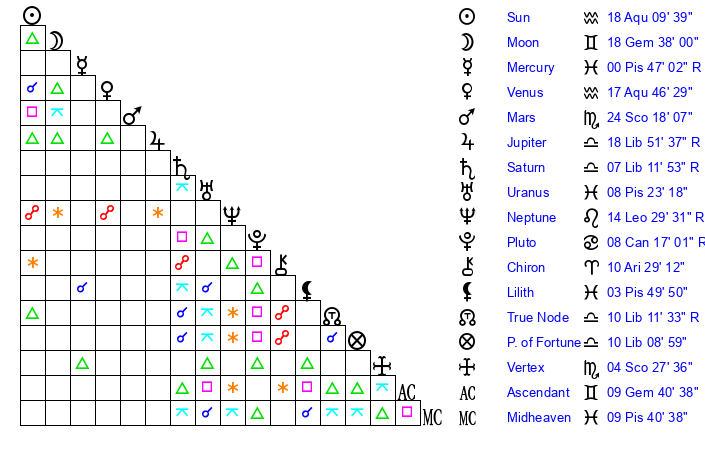 | Saturn | 7 Libra 54 | 18 Pisces 6 | 1 Libra 39 |