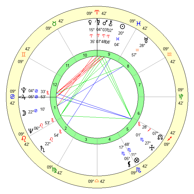 | Moon | 22 Cancer 12 | 22 Leo 9 | 3 Gemini 16 |