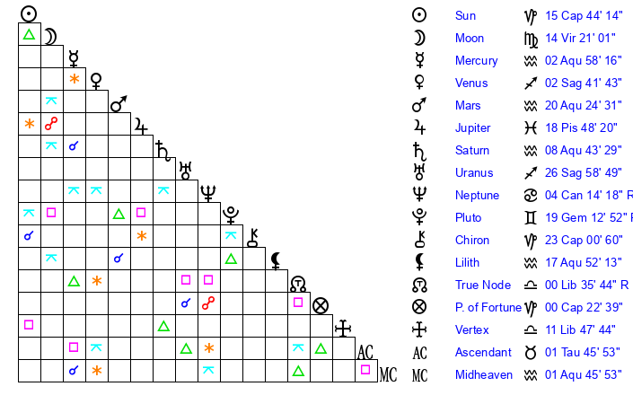 | Moon | 14 Virgo 6 | 23 Aries 28 | 16 Aquarius 1 |