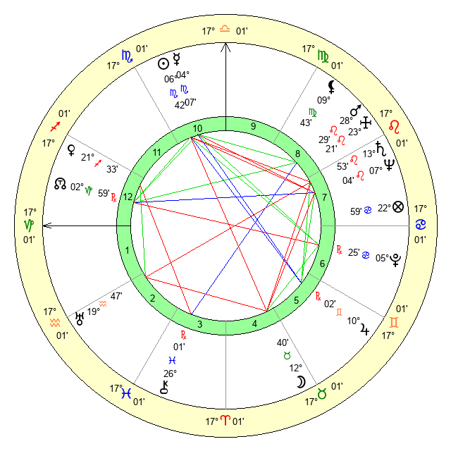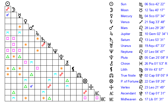 | Sun | 6 Scorpio 42 | 7 Scorpio 31 | 26 Aquarius 13 |