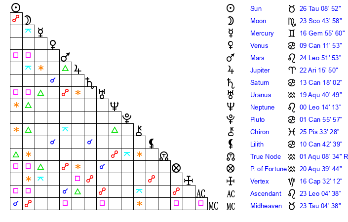 | Moon | 23 Scorpio 42 | 19 Capricorn 40 | 18 Scorpio 3 |