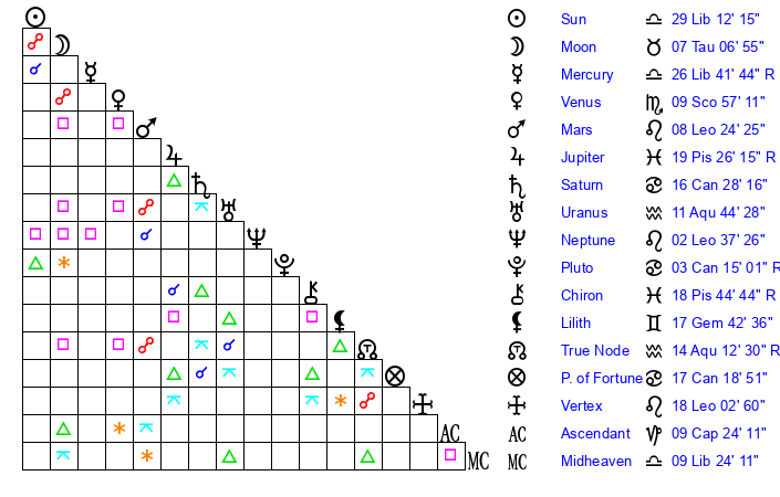 | Moon | 7 Taurus 4 | 24 Scorpio 27 | 18 Taurus 13 |
