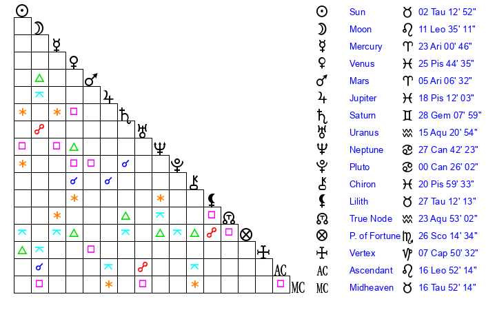 | Moon | 11 Leo 30 | 3 Pisces 23 | 23 Leo 50 |