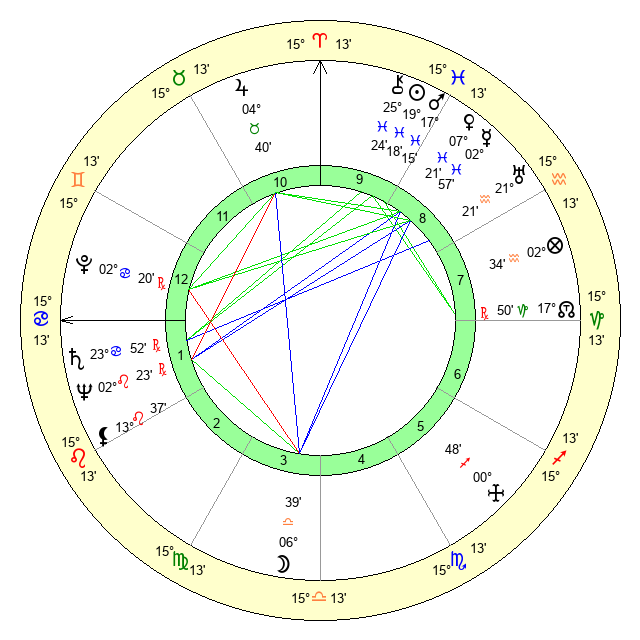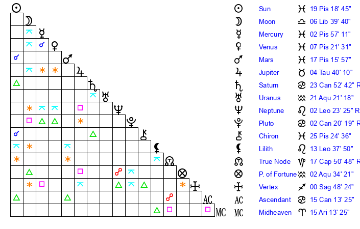 | Sun | 19 Pisces 19 | 20 Pisces 7 | 4 Cancer 14 |