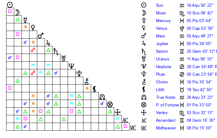| Sun | 16 Aquarius 50 | 18 Aquarius 9 | 5 Gemini 18 |