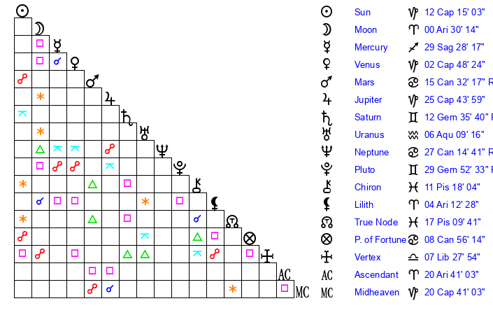 | Venus | 2 Capricorn 48 | 0 Pisces 20 | 21 Taurus 16 |
