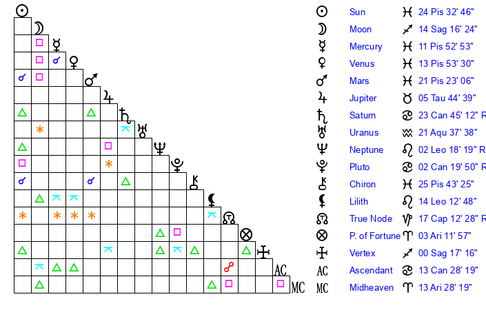 | Saturn | 24 Cancer 32 | 22 Pisces 25 | 1 Leo 32 |