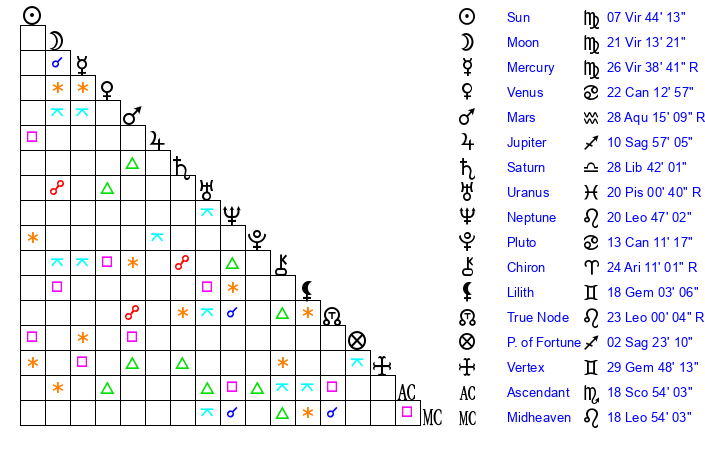 | Mercury | 26 Virgo 39 | 26 Leo 2 | 8 Capricorn 51 |