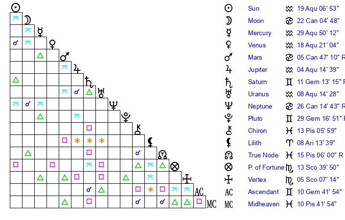 | Sun | 19 Aquarius 7 | 20 Aquarius 11 | 8 Gemini 25 |