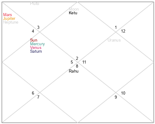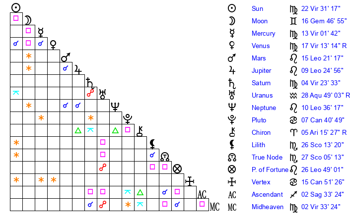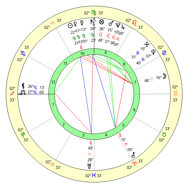 | Saturn | 5 Virgo 2 | 28 Pisces 45 | 12 Virgo 21 |