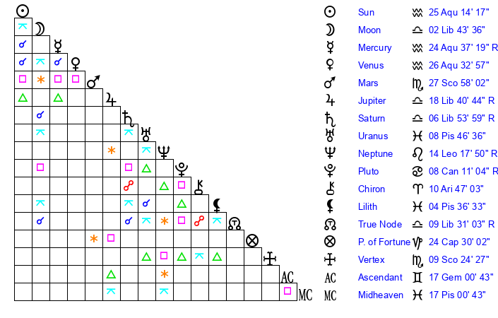 | Sun | 25 Aquarius 14 | 26 Aquarius 15 | 6 Gemini 33 |