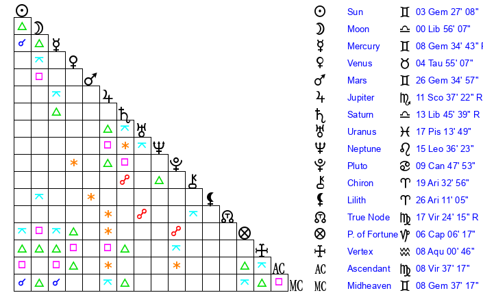 | Moon | 1 Libra 2 | 14 Taurus 43 | 24 Gemini 13 |