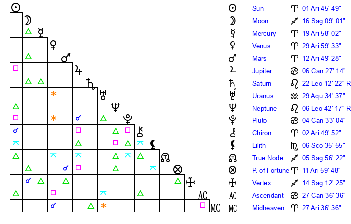 | Sun | 1 Aries 46 | 3 Aries 4 | 14 Cancer 16 |