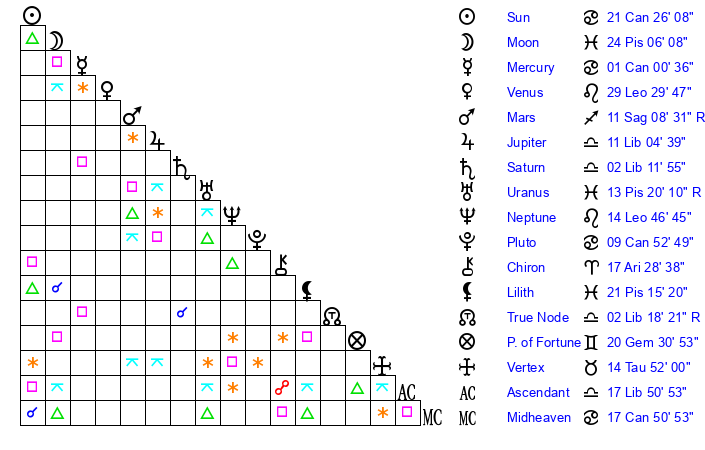| Sun | 21 Cancer 26 | 22 Cancer 30 | 1 Scorpio 30 |