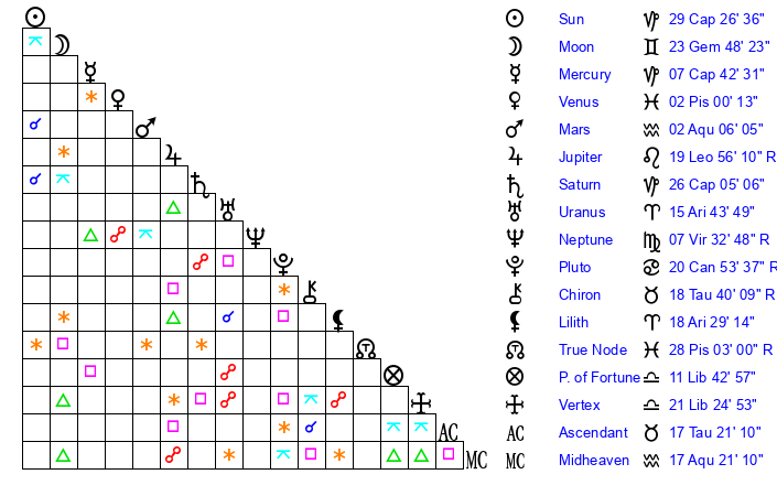 | Sun | 29 Capricorn 27 | 0 Aquarius 53 | 2 Taurus 20 |