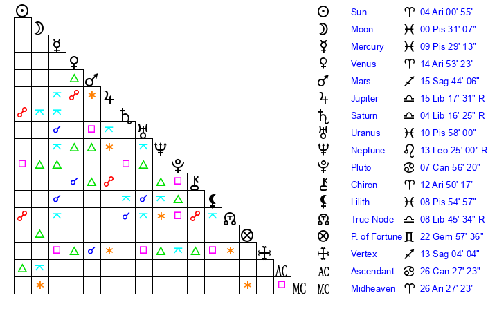 | Moon | 0 Pisces 27 | 10 Aquarius 57 | 11 Sagittarius 4 |