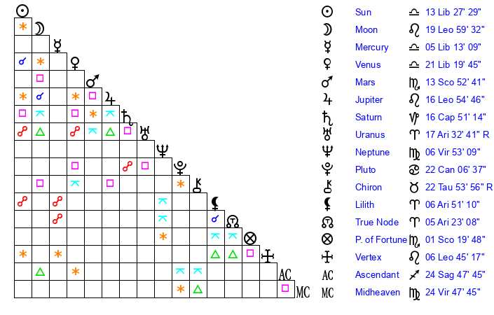 | Moon | 19 Leo 58 | 22 Aries 13 | 9 Aquarius 24 |