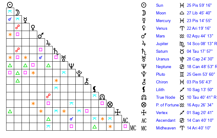 | Sun | 25 Pisces 59 | 27 Pisces 21 | 16 Cancer 21 |