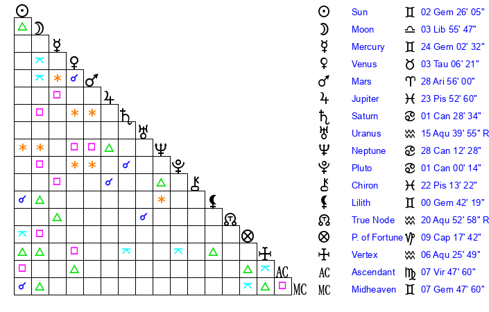 | Sun | 2 Gemini 25 | 3 Gemini 46 | 17 Virgo 51 |