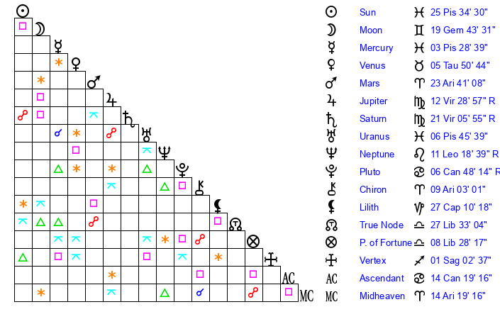 | Sun | 25 Pisces 34 | 26 Pisces 21 | 6 Cancer 25 |