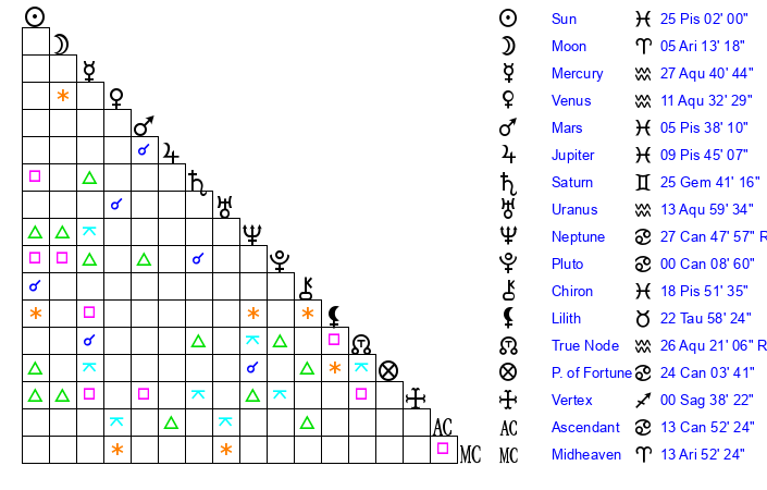 | Sun | 25 Pisces 2 | 26 Pisces 21 | 11 Cancer 37 |