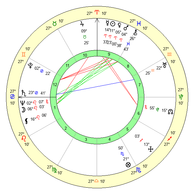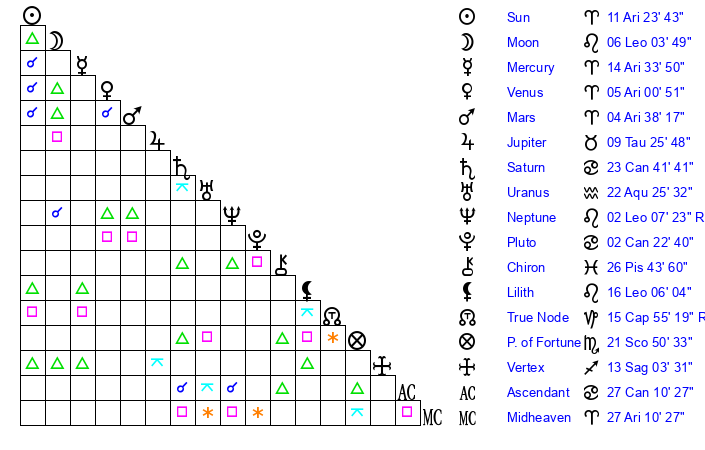 | Sun | 11 Aries 23 | 12 Aries 13 | 25 Cancer 27 |