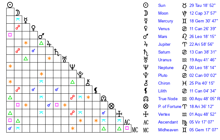 | Uranus | 19 Aquarius 39 | 27 Taurus 28 | 16 Aquarius 38 |
