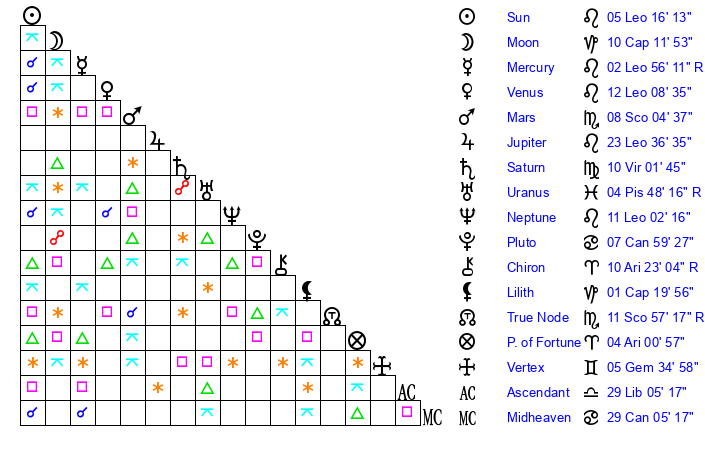 | Mercury | 2 Leo 56 | 11 Leo 24 | 0 Sagittarius 5 |