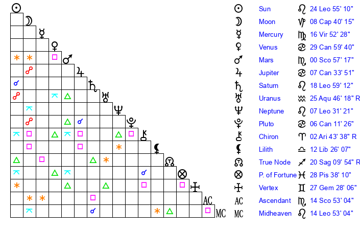 | Sun | 24 Leo 54 | 26 Leo 0 | 10 Sagittarius 44 |