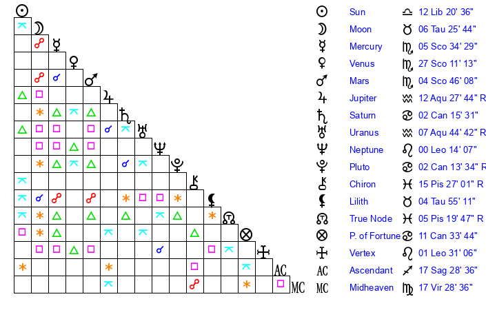 | Sun | 12 Libra 20 | 13 Libra 27 | 4 Aquarius 24 |