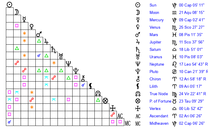| Moon | 21 Aquarius 11 | 0 Aquarius 40 | 28 Scorpio 24 |