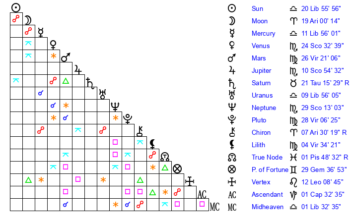 | Venus | 24 Scorpio 32 | 1 Libra 1 | 10 Scorpio 55 |