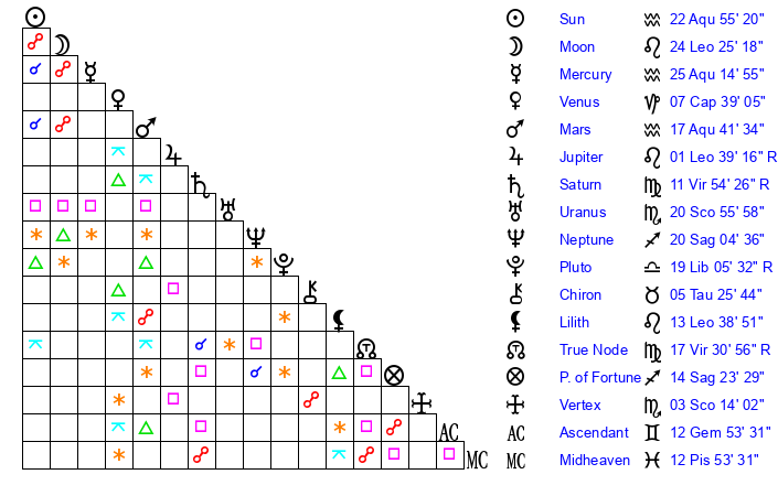 Mercury | 25 Aquarius 15 | 25 Aquarius 54 | 28 Pisces 37 |