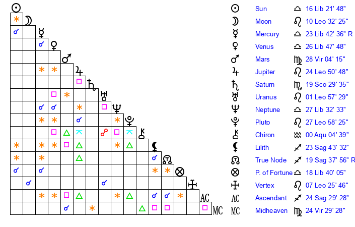 | Moon | 10 Leo 26 | 3 Gemini 21 | 22 Aquarius 51 |