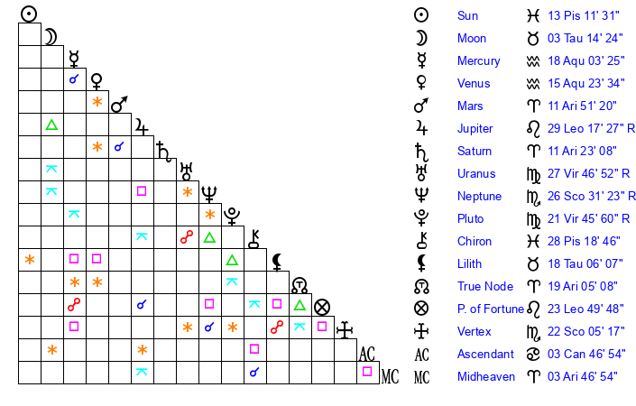 | Saturn | 11 Aries 34 | 20 Pisces 57 | 18 Aries 36 |
