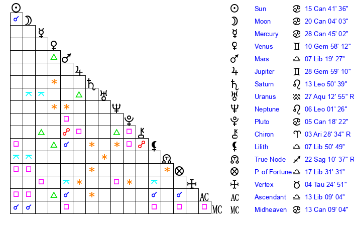 | Moon | 19 Cancer 57 | 21 Sagittarius 46 | 21 Gemini 56 |