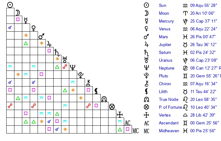 | Moon | 20 Aries 10 | 26 Aquarius 25 | 18 Leo 37 |