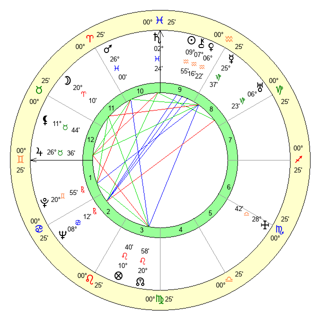 | Sun | 9 Aquarius 55 | 11 Aquarius 3 | 7 Gemini 23 |
