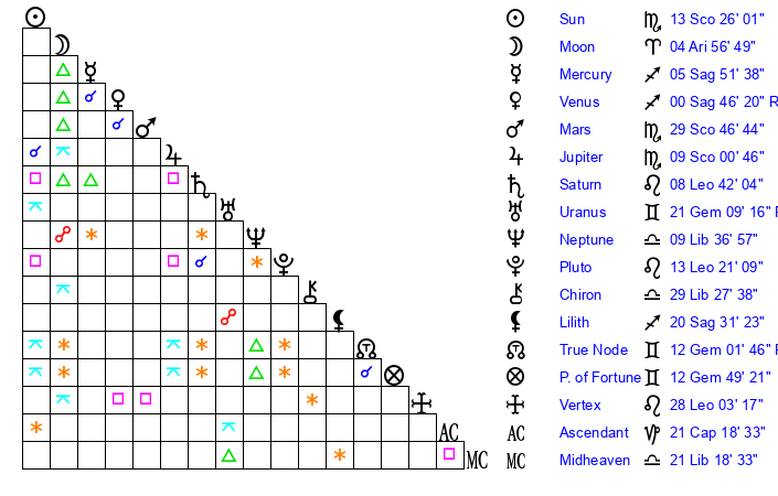 | Sun | 13 Scorpio 26 | 14 Scorpio 31 | 2 Aquarius 36 |