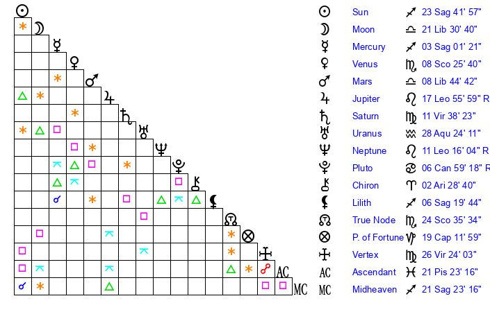 | Venus | 8 Scorpio 25 | 19 Sagittarius 58 | 16 Pisces 2 |