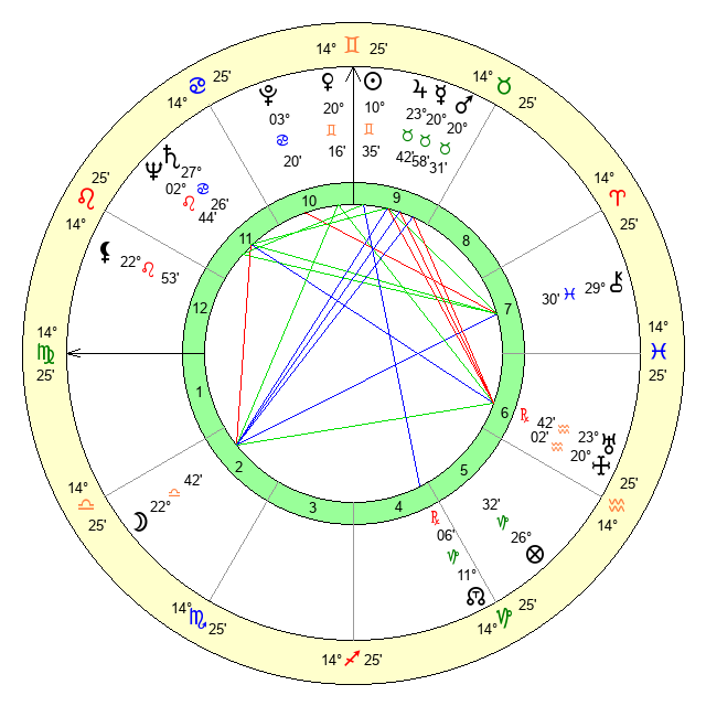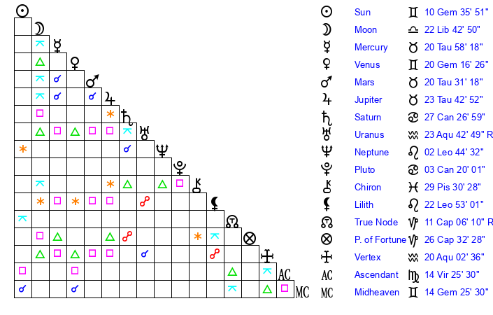 | Sun | 10 Gemini 36 | 11 Gemini 27 | 24 Virgo 12 |