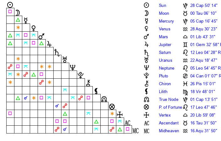 | Sun | 28 Capricorn 50 | 29 Capricorn 52 | 15 Taurus 20 |
