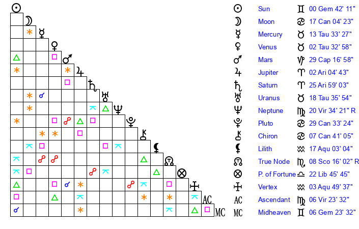 | Sun | 0 Gemini 41 | 1 Gemini 51 | 22 Leo 55 |
