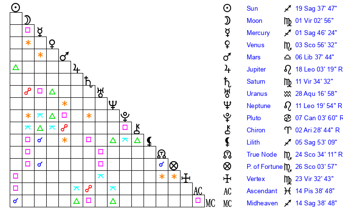 | Sun | 19 Sagittarius 38 | 20 Sagittarius 55 | 6 Aries 43 |