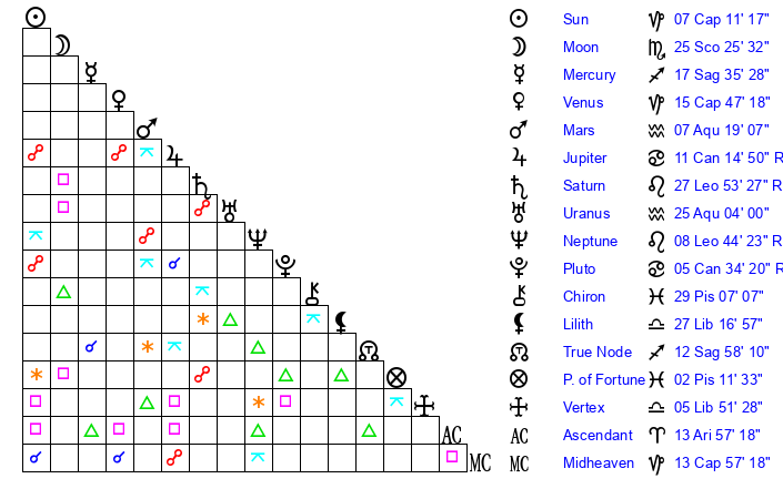 | Mercury | 17 Sagittarius 35 | 25 Sagittarius 10 | 12 Aries 15 |