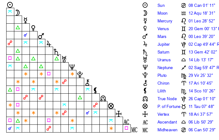 | Moon | 12 Aquarius 23 | 2 Virgo 54 | 21 Capricorn 4 |